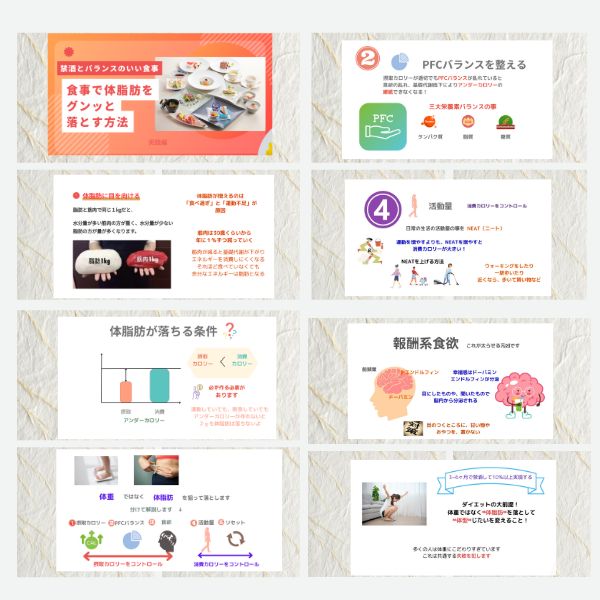 ダイエットの講座資料 図解をたくさん使い、目で見ながら 説明も併せてお客様にイメージが出るように作成しました。