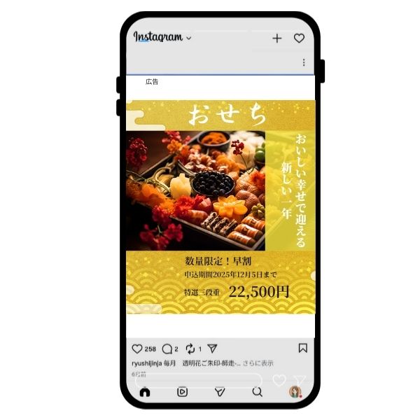 おせちのバナーを作成しました。 インスタグラの広告に使うとのことで、お正月らしい色目にしてほしいとの依頼。 背景とゴールドで特別感とお正月だとわかるように作成しました。